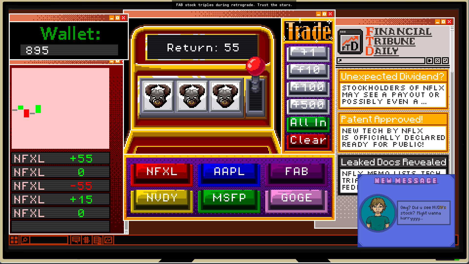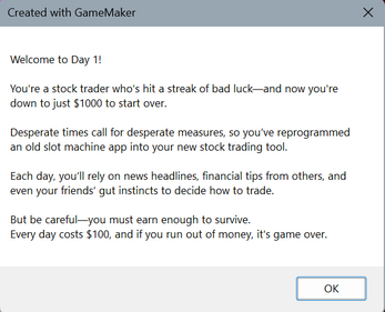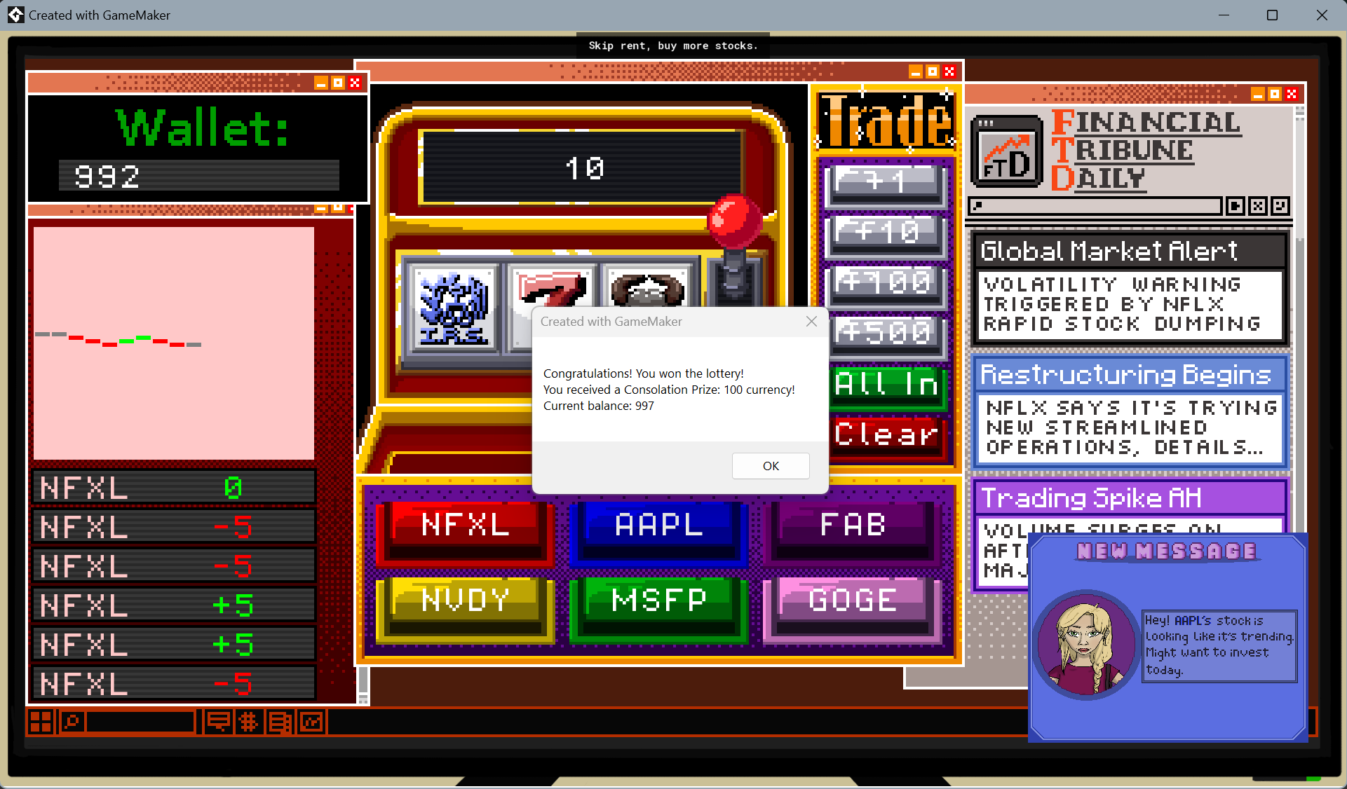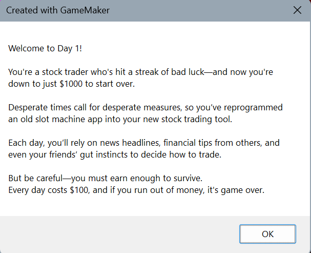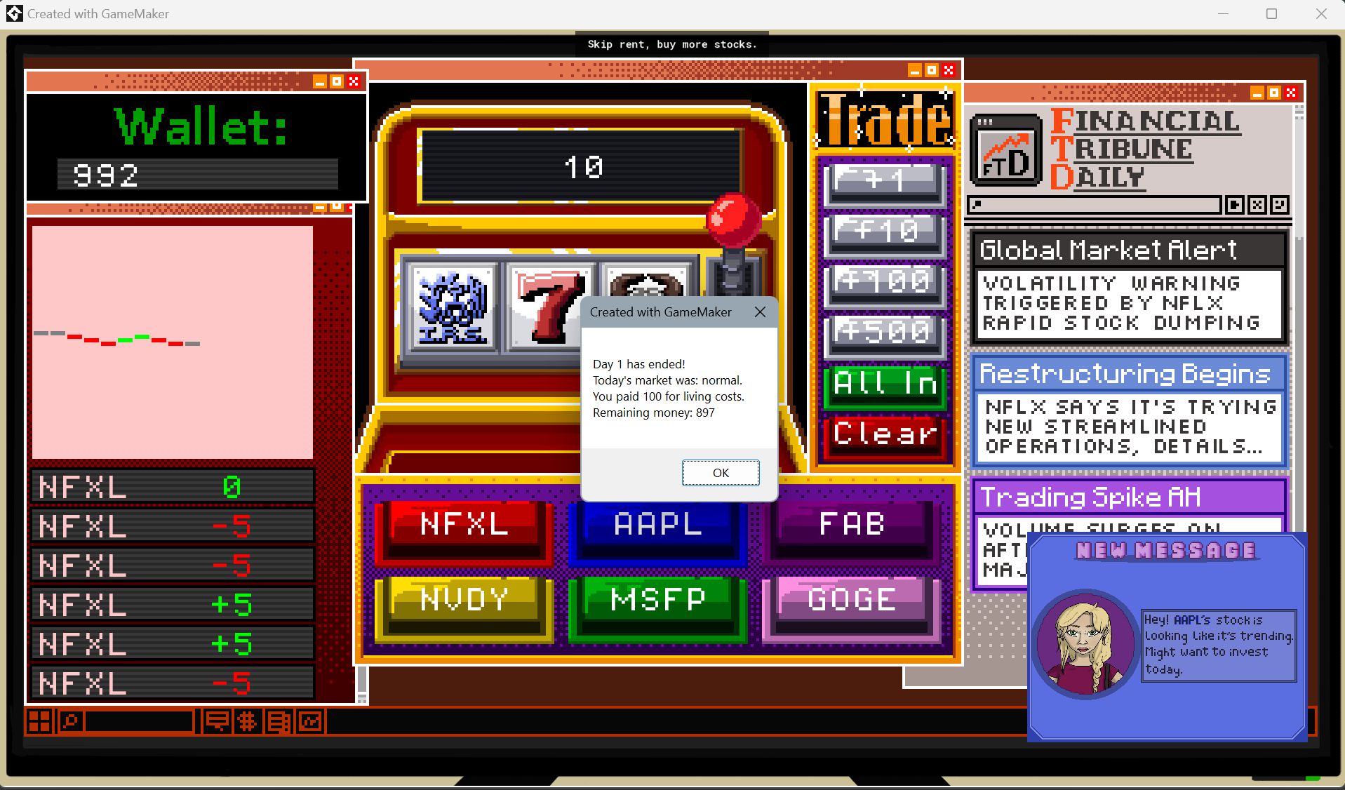 Slot Trader is a day trading simulator. You are down on your luck, so you turn to day trading to get rich quick! You modify the slot machine program you lost almost all your money on into a trading software and begin to ride the markets.